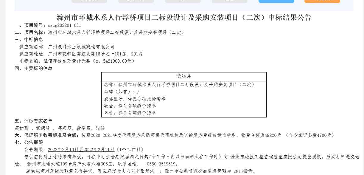 2022年02月09日,我公司中標(biāo)滁州市環(huán)城水系人行浮橋項(xiàng)目二標(biāo)段設(shè)計(jì)及采購安裝項(xiàng)目。