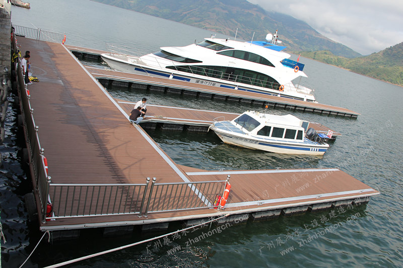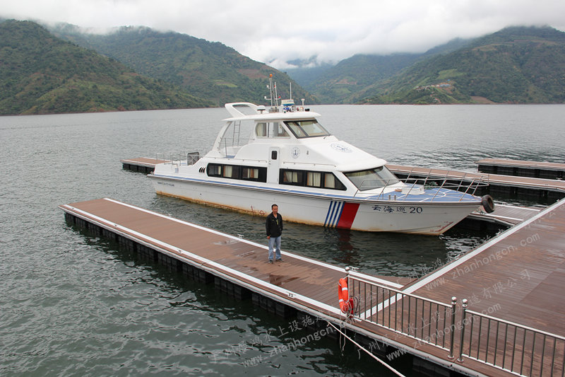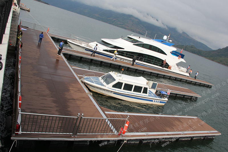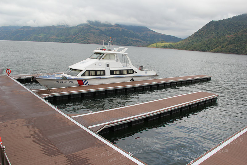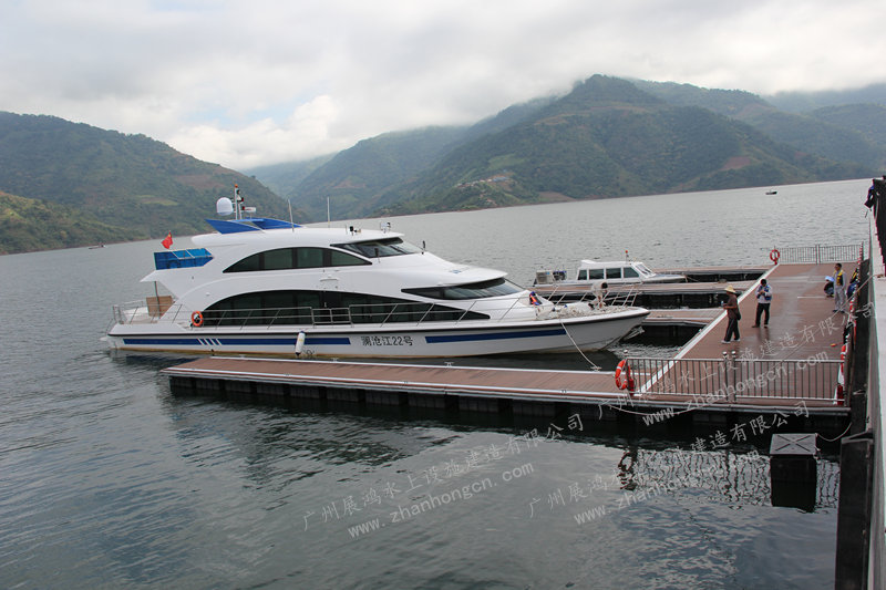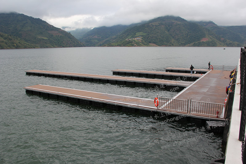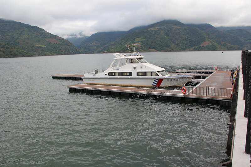 我司充分考慮當(dāng)?shù)貧夂驐l件、庫(kù)區(qū)風(fēng)浪及水位變幅、船只系纜位置分布、現(xiàn)場(chǎng)交通燈特點(diǎn),浮動(dòng)碼頭應(yīng)與船體長(zhǎng)、寬相匹配,外觀大氣、美觀,檔次較高,結(jié)實(shí)耐用,且穩(wěn)定性好,安全性能高。所以浮動(dòng)碼頭與岸坡進(jìn)行連接固定采用鋼絲繩牽引固定或滑軌固定兩種方式,該浮動(dòng)碼頭滿足三艘船只??浚捎?/span>E型布置形式。