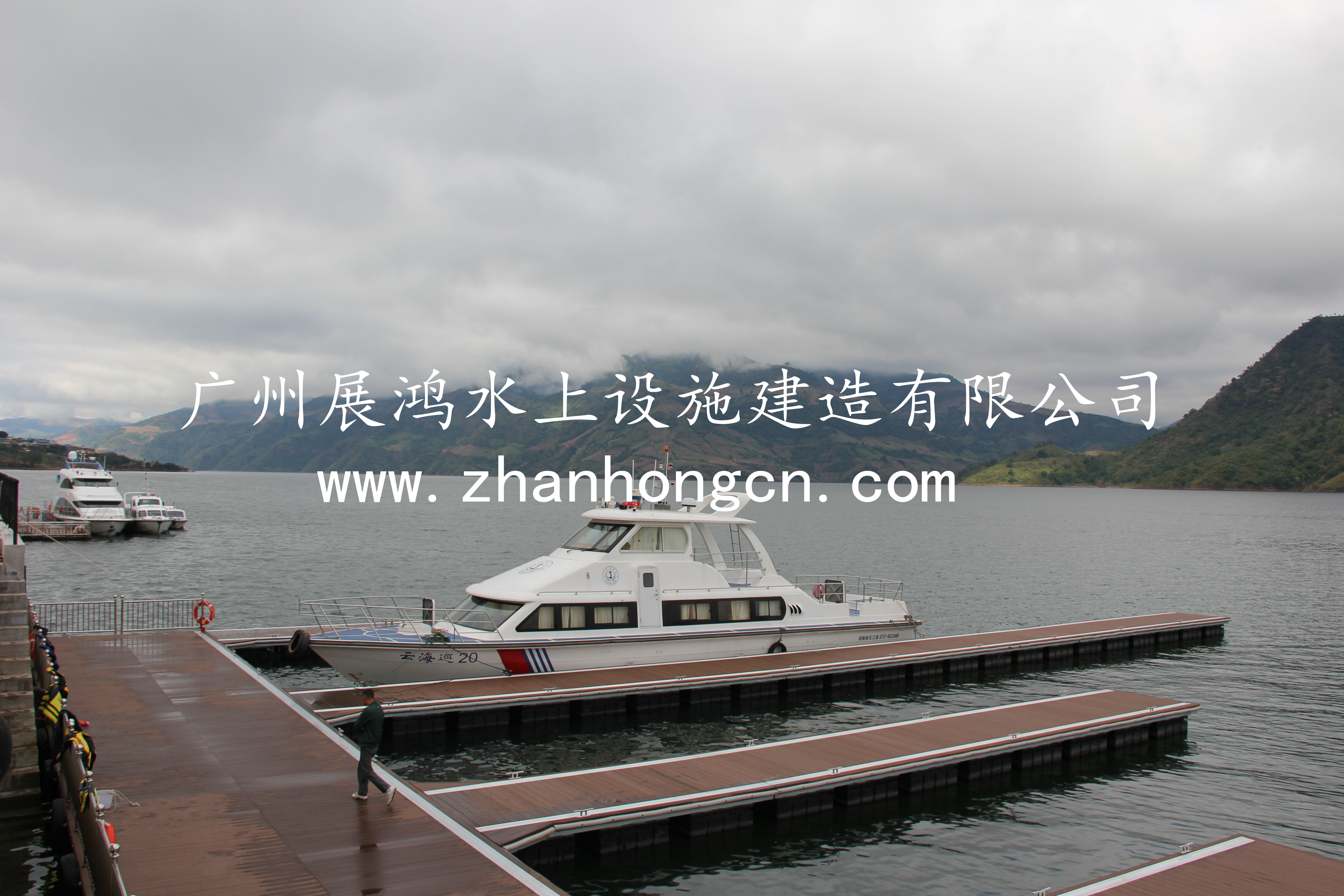 我司充分考慮當?shù)貧夂驐l件、庫區(qū)風(fēng)浪及水位變幅、船只系纜位置分布、現(xiàn)場交通燈特點,浮動碼頭應(yīng)與船體長、寬相匹配,外觀大氣、美觀,檔次較高,結(jié)實耐用,且穩(wěn)定性好,安全性能高。所以浮動碼頭與岸坡進行連接固定采用鋼絲繩牽引固定或滑軌固定兩種方式,該浮動碼頭滿足三艘船只???,采用E型布置形式。